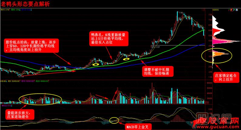 在波浪式推進(jìn)黑馬形態(tài)中,股價(jià)經(jīng)常在一波上漲后,進(jìn)行短暫的調(diào)整,且當(dāng)調(diào)整到重要價(jià)格平均線(20日、30日、60日等,在這里以60日價(jià)格平均線為準(zhǔn))附近再次起漲,重新開始新的一浪,并不斷的重復(fù)著這樣一個(gè)輪回,這種形態(tài)就是平時(shí)我們所說的波峰與波谷。而這種形態(tài)恰似生活中鴨子的頭部,故命名為老鴨頭形態(tài)。老鴨頭形態(tài)是牛市中最常見的推進(jìn)形態(tài)。