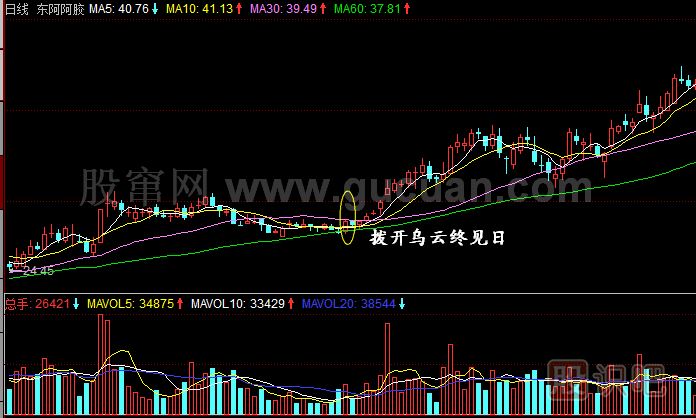 首先我們來看一下,這組K線并不是在股價連續(xù)上漲之后出現(xiàn)的,而是在充分調(diào)整了一段時間之后才出現(xiàn),而且陽線成交量明顯放大,第二天的陰線成交量卻嚴重縮小。如果股價沒有經(jīng)過大幅拉升,說明莊家沒有出貨的動機,同時成交沒有明顯放大,說明莊家沒有出貨的行為。那么這樣的烏云蓋頂或許就只是暫時的,我們不應(yīng)該急于作出投資決定,而應(yīng)該觀察接下來的走勢。事實也正是如此,該股在接下來的幾個交易日中放量走強,站上了多條均線,這就是撥開烏云終見日。