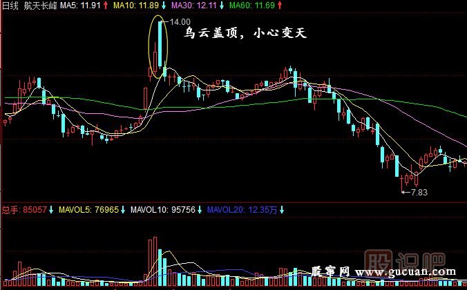 我們需要結(jié)合實際情況來分析,烏云蓋頂看跌信號是否明確跟兩個因素有關(guān),一是陰線處的量能,二是陰線的長短。