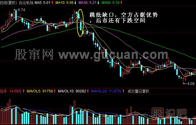 再看白云機(jī)場(chǎng)圖示,2010年4月16日,白云機(jī)場(chǎng)(600004)收出一根陰線,次日繼續(xù)跳空低開,收出跳低K線,此時(shí)就應(yīng)當(dāng)順勢(shì)做空先行賣出。
