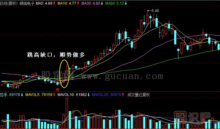 實(shí)例1:2010年3月17日,順絡(luò)電子(002138)收出一根大陽線,此時(shí)股價(jià)站上多條均線,次日股價(jià)跳空高開,收出一根跳高的K線,此時(shí)就可以順勢(shì)做多進(jìn)行買入操作,如圖所示。