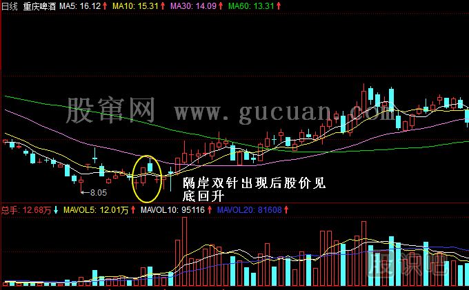 雙針探底圖形會(huì)出現(xiàn)一定的變異,具體表現(xiàn)為兩根十字星K線并未出現(xiàn)在連續(xù)兩個(gè)交易日內(nèi),而可能會(huì)隔上幾個(gè)交易日,這樣的K線稱為隔岸雙針。由于中間隔著的僅有幾根K線,并未對(duì)市場交易的性質(zhì)產(chǎn)生較大改變,因此其作用與雙針探底相當(dāng),投資者在實(shí)戰(zhàn)中要學(xué)會(huì)辨認(rèn)。