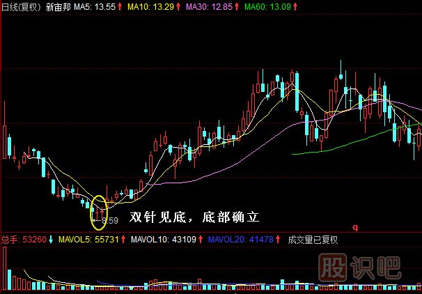 1.雙針探底K線組合是一組預(yù)示股價(jià)見底信號(hào)的K線組合。