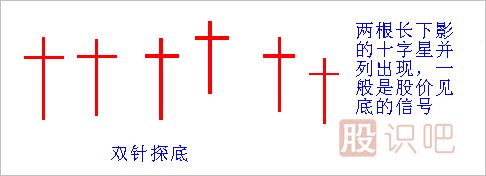 2.雙針探底K線組合由兩根K線組成,且兩根K線都是帶有長下影線的十字星。