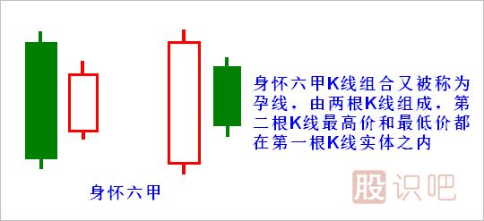 身懷六甲,是一個很形象的詞語,用在股市術(shù)語中,是指后面收出的K線實體全部被前面的K線實體所包含,后面的K線如同前面K線身體里懷著的胎兒,因此身懷六甲K線組合又被稱為母子線或孕線,如圖所示。