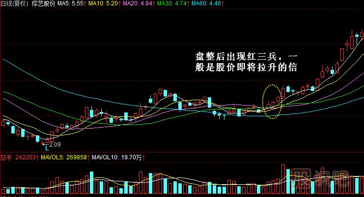 3.紅三兵出現(xiàn)在大幅下跌后是強(qiáng)烈的轉(zhuǎn)勢信號,出現(xiàn)在盤整區(qū)是股價即將拉升起漲的信號。