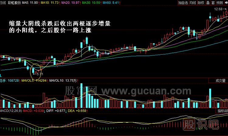 實例2:如下圖所示,2009年8月19日,彩虹股份(600707)在經(jīng)過連續(xù)大幅殺跌之后,再創(chuàng)新低。此時很多投資者心里是極度恐慌的,并且會選擇賣出。而在接下來的兩天,該股連續(xù)收出小陽線,股價出現(xiàn)了止跌的跡象,同時成交量也有所放大,這兩個成交量增大的小陽線就是主力進(jìn)場吸貨的標(biāo)志。而在收出海底月之后,該股出現(xiàn)放量大陽線,再次確認(rèn)了這個海底月平臺轉(zhuǎn)勢的準(zhǔn)確性,更多的投資者開始從看空轉(zhuǎn)為看多并買入,股價便在猶豫之中越漲越高,最后走出了一波大幅上漲的行情。