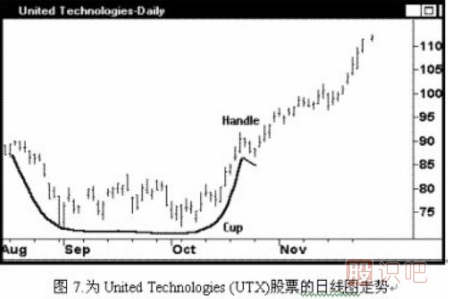 例圖7.為United Technologies (UTX)股票的日線圖走勢(shì),注意其杯把部分的回抽恰到好處,僅僅數(shù)日即宣告完成。