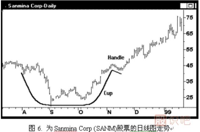 例圖6. 為Sanmina Corp (SANM)股票的日線圖走勢(shì),科技股經(jīng)常成為上佳的“杯與杯把”形態(tài)的候選品種,原因是投資者總是更樂(lè)于追捧這類(lèi)股票