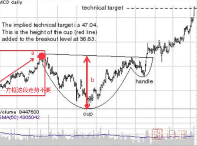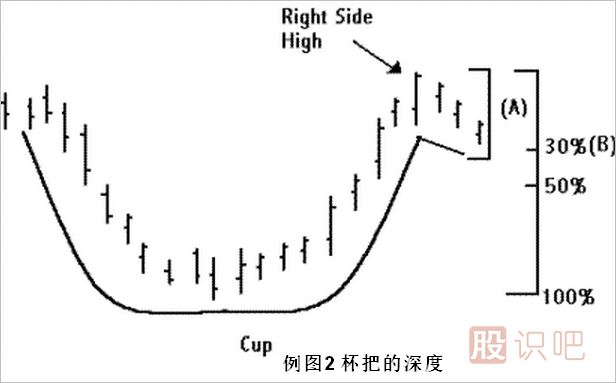 與此相關(guān)的是,杯的深度也是具有爭(zhēng)議性的,我們通常認(rèn)為,一個(gè)標(biāo)準(zhǔn)杯的底部至少要比杯的左半部分高點(diǎn)要低20%,但不應(yīng)超過(guò)40%,例如,若杯的左半部分高點(diǎn)為100元的話,則杯的底部應(yīng)當(dāng)處于60元(低20%)至80美(低40%)之間。