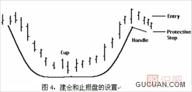 例圖4,所顯示的是建倉(cāng)和止損盤(pán)的設(shè)置,當(dāng)股價(jià)突破當(dāng)前的高點(diǎn)后才建倉(cāng),這時(shí)該股票已經(jīng)重納升軌,此時(shí)建倉(cāng)實(shí)為順?biāo)浦?,假如股價(jià)跌破杯把的低點(diǎn)將宣告這一形態(tài)失效,此時(shí)在貼近杯把底部的下放設(shè)置止損盤(pán)可以將損失降至最低。