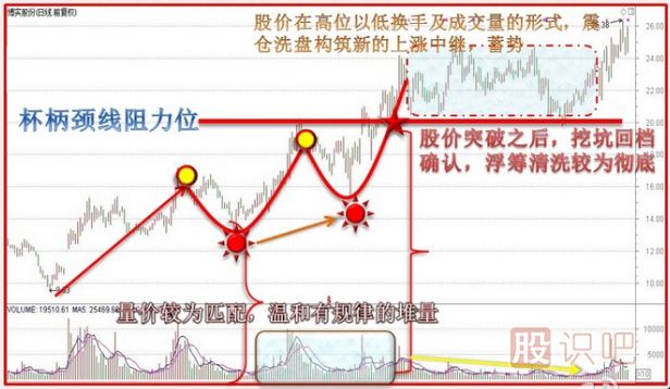 在杯的右半部分形成階段,一旦出現(xiàn)向上突破的走勢(shì),成交量又會(huì)再度出現(xiàn)增長(zhǎng)的勢(shì)頭,為持續(xù)的上升提供能量,最后,在杯把形成階段股價(jià)出現(xiàn)獲利回吐時(shí),成交量開(kāi)始出現(xiàn)萎縮,在這一階段若出現(xiàn)巨大的成交量,就要警惕這決不僅僅是一般意義上的獲利回吐了,而是有可能出現(xiàn)新一輪的下跌。