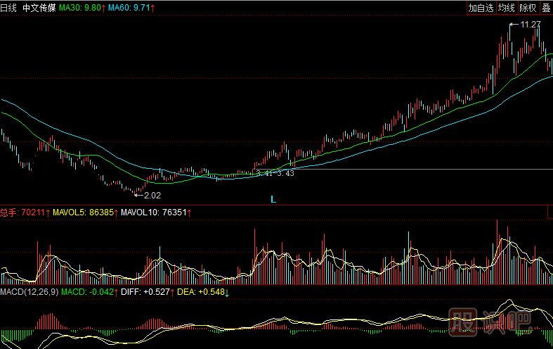 實例:中文傳媒600373,自2008年12月下旬30日線上叉60日線后開始了一輪大級別的上漲行情,30日線和60日線金叉是中線看多的信號,此后很長一段時間內(nèi),這只股票30日線從未下叉過60日均線。