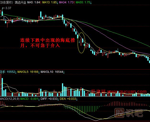 海底撈月與海底月很不一樣,海底月是先下跌,然后低位收出放量的兩個(gè)小陽。而海底撈月則是在上升過程中股價(jià)大幅低開,然后再大幅拉起。這類股票往往是主力利用消息面的利空,掃走膽小散戶手中的籌碼。低位入貨,順帶洗盤。短期彈升的概率非常大,可陰在撈月當(dāng)天收盤前快速介入。