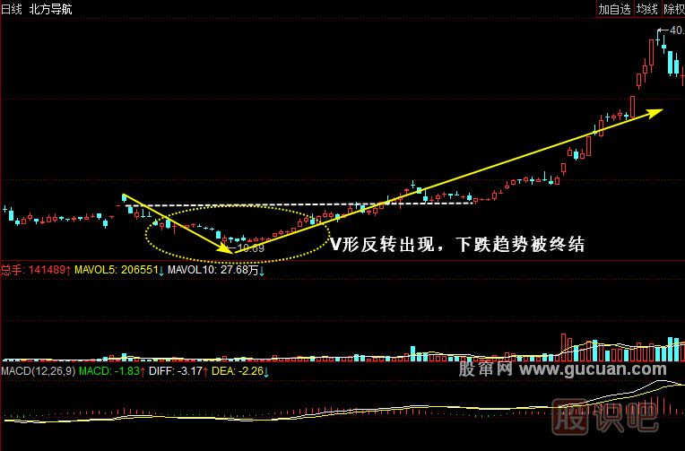 我們分析,在新低之前的下跌是連續(xù)的無反抗的,而自創(chuàng)出10.69元的最低價(jià)后的上漲也是連續(xù)的無反抗的,兩段區(qū)間運(yùn)行形成了一個(gè)形似“V”字的圖形。此時(shí)所形成的K線形態(tài)就是V形反轉(zhuǎn)。