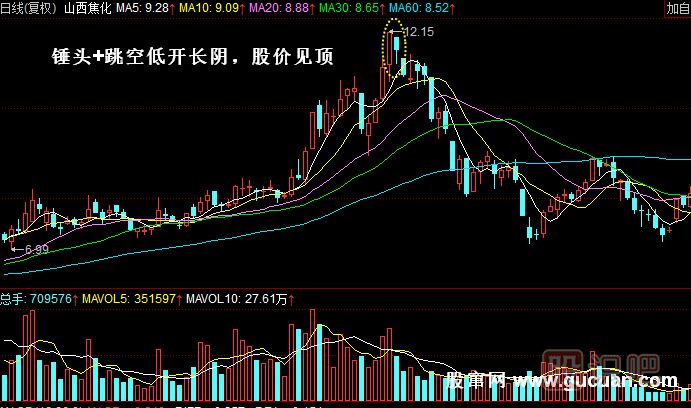 實(shí)例2:如圖所示,2009年8月5日,山西焦化(600740)經(jīng)過連續(xù)三根大陽線的上漲之后,收出一根陰錘頭線,此時(shí)多方已成強(qiáng)弩之末,