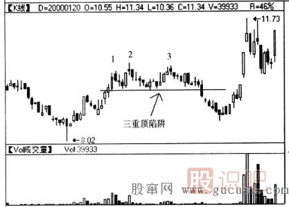 三重頂是比較少見的轉(zhuǎn)勢形態(tài),基本上可屬于頭肩頂?shù)淖儺?。因此,其頂部反轉(zhuǎn)意義的可靠性也依賴于市場價格對頸線是否形成有效的突破。如果股價有效擊穿頸線,其伴隨著成交量的萎縮,此時三重頂頂部形成的信號是比較可靠的。反之,如果股價未形成對頸線的有效突破,股價隨之升至頸線之上,此時的突破就是假突破,三重頂形態(tài)的演變成了三重頂陷阱(如圖)