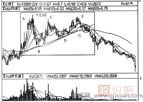 案例2:如圖所示,方框內(nèi)的形態(tài)叫做三重頂,三重頂形態(tài)的三個頂分別為圖中的A、C、E三點,連接兩個波谷的低點B、D便得到該形態(tài)的頸線。三重頂出現(xiàn)在市場高位,預(yù)示著股價將見頂回落,投資者宜選擇好時機賣出股票。一般而言,在股價突破頸線的位置G(圖中圓圈部位)是最佳賣點,頸線一旦被有效突破,股價將一瀉千里,那時再賣出,投資者將蒙受更大的損失。