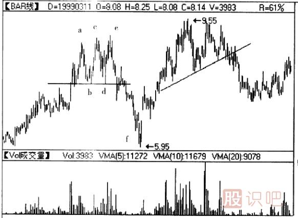 (2)由三個波峰組成,三個波峰都處于相同價格水平,每個波峰的形成都伴隨成交量的大幅萎縮。三重頂是頂部反轉(zhuǎn)形態(tài)之一,是股價見頂回落的信號。投資者見到該種形態(tài)應(yīng)盡早離場出局,以免蒙受損失。本案例中有兩個三重頂形態(tài)出現(xiàn)在走勢圖中,在前一個三重頂中,我們可以看到頸線被突破之后的反撲,股價圍繞頸線爭持不下;c點和e點略高于a點,如果以最高點e到b—d的垂直高度作為價格在突破頸線之后的目標的話,那么我們可以從頸線位置到f點的距離看到,這個目標距離被大大地超越了。后一個三重頂中,這種頸線被突破后的反撲也發(fā)生了,而且頸線之后的目標距離也與頸線之上的形態(tài)規(guī)模(最高價至頸線的垂直距離)相對稱。以上兩個三重頂?shù)姆崔D(zhuǎn),都令該股股價朝下跌的方向走了很遠。