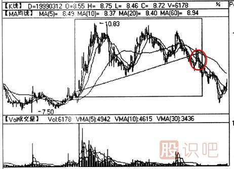 案例3:如圖所示,框內(nèi)的形態(tài)叫做三重頂,三重頂由三個波峰構(gòu)成,且三個波峰所處的價格水平比較接近。連接三個波峰之間的兩個波谷最低點就得到三重頂?shù)念i線,三重頂是頂部反轉(zhuǎn)形態(tài)之一,投資者遇到該種形態(tài),應(yīng)在股價突破頸線之后、有所回調(diào)時賣出離場(如圖中圓圈處)