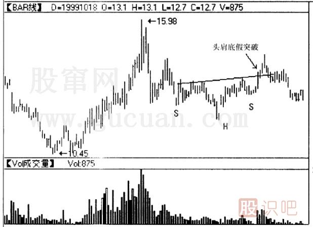 但是我們不能排除這樣一種情況:頭肩底形態(tài)形成時,股價突破頸線,但不久股價突然又返回到頸線的另一邊,此時股價對頸線的突破信號是無效的,突破也就是成了“假突破”,投資者就很容易陷入頭肩底陷阱。如圖