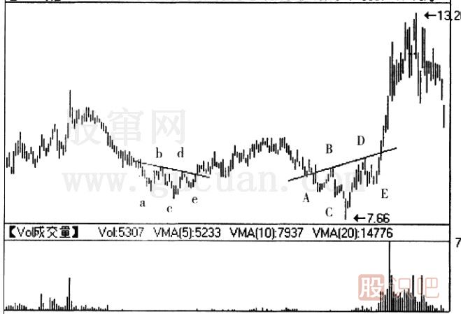 圖中的兩個頭肩底反轉形態(tài)出現(xiàn)在某只股票的走勢圖上,從圖中我們可以看到:前一個頭肩底中當頸線b—d被突破之后,價格的反撲始終未擊破b—d的支撐,隨后維持了一段漲勢。在后面一個頭肩底中,其頸線B—D是向上傾斜的,這與頭肩底的頸線向下傾斜的慣例有些不相符。但恰恰是這種向上傾斜的頸線,預示著隨后展開的上漲行情會有較大的力度。從圖中可以看到,B—D被突破后,上升趨勢是何等強勁。
