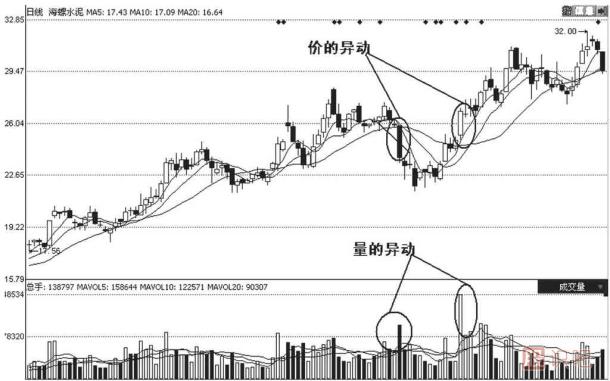 以海螺水泥(600585)的股價走勢圖為例來說明異動股的圖譜表現(xiàn)形式。如圖3-43中左側(cè)橢圓標(biāo)示的位置,在股價緩慢上升的途中,突然某天拉出一個大陽線配以巨量的成交量,或者在股價下降的途中,成交量一直處于萎靡甚至縮量的形態(tài),在某天突然出現(xiàn)一個巨量(如右面的圓圈)處,這都屬于從該股中捕捉到的異動情況。此外,判斷個股異動的情況的方法還有:
