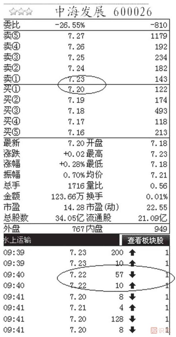 圖3-41就是中海發(fā)展(600026)在2011年11月11日星期五下午9:46時(shí)的盤(pán)口。該股買①到買⑤的價(jià)格為7.16?7.20元,賣①到賣⑤的價(jià)格分別為7.23?7.27元。但是,可以在上圖的盤(pán)口中明顯地看出,該股票在9:40的時(shí)候分別出現(xiàn)了57手和10手以7.22元成交的買盤(pán)和賣盤(pán),這就是隱性買賣盤(pán)。