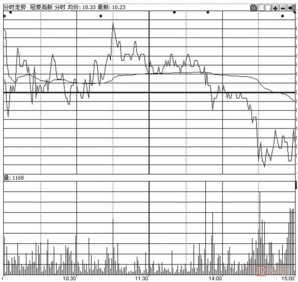 第二種可能性:跳水后成交量依然不小,股價(jià)略有回升后繼續(xù)下跌。由于指數(shù)在上漲,大幅下跌的股價(jià)就會(huì)吸引市場(chǎng)的接單。但這些掛單大多只是逢低接納,而市場(chǎng)賣(mài)單一時(shí)還難以接受跳水后的價(jià)位,所以仍然掛在上面。因此,真正的交易狀態(tài)應(yīng)該是短時(shí)間內(nèi)成交稀少。然而,現(xiàn)在則是成交活躍,而且大都是在跳水后的相對(duì)低位,所以只能理解為主力在繼續(xù)賣(mài)出。