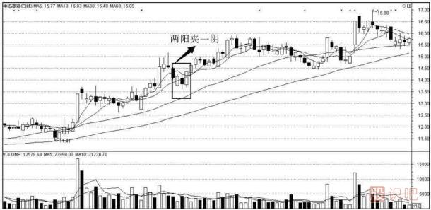 (1) 兩陰夾一陽的K 線組合圖形既可以出現(xiàn)在漲勢中,也可出現(xiàn)在跌勢中,在漲勢中出現(xiàn),是見頂信號; 在跌勢中出現(xiàn),繼續(xù)看跌。