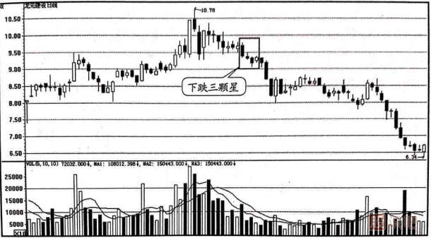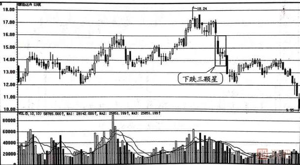 下跌三顆星屬于下跌中繼走勢,其中的三根并排的小K線收盤價如果沒有向上突破陰線實體二分之一以上,表明股價反彈無力,市場買賣意愿不強,股價仍然處于弱勢,還有下探的空間。