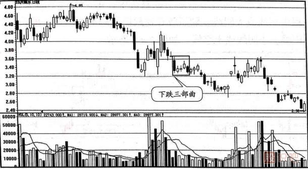 下跌三部曲通常出現(xiàn)在股價的下跌趨勢中,它由五根K線組成。 第一根是長陰線,第二到第四根是三根實體較小的陽線,它們的最高價都低于第一根陰線的最高價,最后一根是收盤價低于第一根陰線收盤價的大陰線,如圖1-47所示。接下來由股識吧來侃侃多根K線下跌三部曲賣出,不了解的來看看吧。