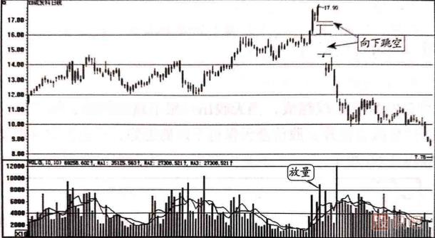 如圖1-40所示的是成發(fā)科技(600391)的日k線走勢圖。該股從前期低點(diǎn)11.50元開始了一輪上升行情,最高漲到了近18.00元,漲幅已經(jīng)接近60%。隨后,在圖中標(biāo)識處形成了連續(xù)兩個向下跳空的走勢,第一次留下的跳空缺口比較小,但是出現(xiàn)跳空的當(dāng)天成交量出現(xiàn)了明顯的放大,也就是下跌放量;第二個跳空缺口非常大,幾乎是前一個跳空缺口的5~6倍之多,股價也以跌停報(bào)收。這種走勢已經(jīng)很明顯地預(yù)示了未來股價的下跌趨勢。 因此,投資者必須及時賣出手中的持股,以規(guī)避后市大幅下跌帶來的風(fēng)險。