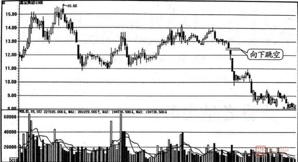 向下跳空中的股價在第二天的運(yùn)行中空方的力量明顯比多方的力量要強(qiáng)得多。 如果這種走勢是出現(xiàn)在股價長期或大幅上漲的頂部高位區(qū)域,則標(biāo)志著股價出現(xiàn)下跌的可能性相當(dāng)大;如果向下跳空出現(xiàn)在股價下跌的中途,往往是股價進(jìn)人加速下跌的征兆。 無論股價出現(xiàn)在哪一個位置,都是投資者減倉或清倉的時機(jī)。