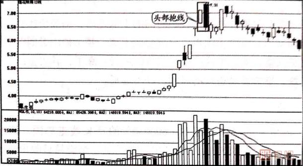 頭部抱線由兩根K線組成,第一根K線在高位收出一根陽線,第二根K線大幅高開后,在大成交量的配合下返身向下,以低于前一根K線的最低價收盤。從圖形上看,第二根K線將前一根K線完全吞沒(可以不包括前一根K線的上下影線),如圖1-27所示。接下來由股識吧來跟您說多根K線頭部抱線賣出,搞不懂的來了解一下呀。