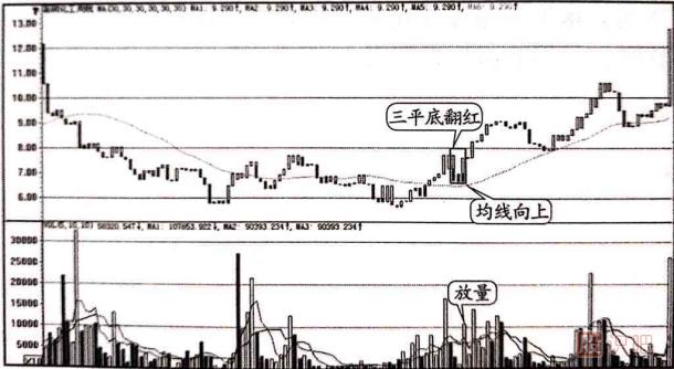 三平底翻紅是指在周K線中,當(dāng)股價(jià)經(jīng)過長時(shí)間的大幅下跌(一般跌幅要求超過50%以上)后,30周均線開始走平或緩緩向上,寶塔線指標(biāo)在30周均線上方出現(xiàn)第一次三平底翻紅,即在連續(xù)的三個(gè)周K線中,后兩周的最低價(jià)沒有超過第一周的最低價(jià),而最后一周的收盤價(jià)超過第二周的開盤價(jià),并且成交量比前周成交量出現(xiàn)明顯放大,如圖1-1所示。接下來由股識(shí)吧來來聊寶塔線指標(biāo)三平底翻紅買入,由小編為大家分析一下。