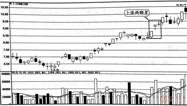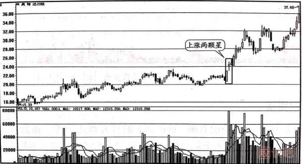 上漲兩顆星屬于常見(jiàn)的上漲中繼形態(tài),一般出現(xiàn)在大行情的初期。 大陽(yáng)線(xiàn)之后連續(xù)出現(xiàn)勢(shì)均力敵的信號(hào)意味著多空雙方的力量在新的條件下取得了平衡,空方?jīng)]有打壓股價(jià)的力量,多方的勝利被鞏固了,投資者對(duì)股價(jià)的上漲已經(jīng)取得了共識(shí),大陽(yáng)線(xiàn)取得的成果已經(jīng)得到市場(chǎng)的認(rèn)同,這往往是股價(jià)大幅度攀升的先兆。