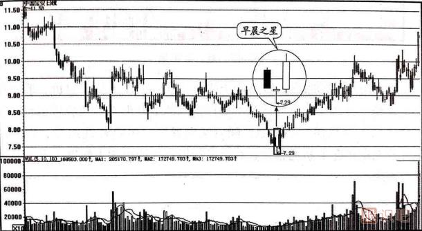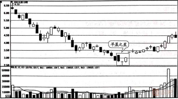 早晨之星是一種非常典型的股價(jià)見底信號(hào),如果它出現(xiàn)在股價(jià)運(yùn)行下跌趨勢(shì)的末期,或者出現(xiàn)在股價(jià)暴跌的極大跌幅處,那么它表明股價(jià)已經(jīng)見底或是離底部不遠(yuǎn),投資者應(yīng)及時(shí)分批適量入場(chǎng)進(jìn)貨。