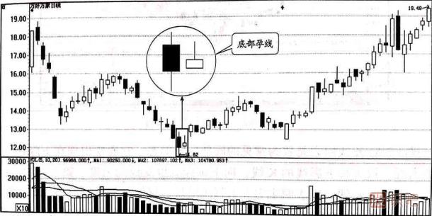 在股價運行處于下跌的走勢之中,一旦出現(xiàn)底部孕線的K線組合,就預示著此時空方的下跌動能已經(jīng)出現(xiàn)了衰竭,股價下跌的力度開始轉(zhuǎn)弱,或者是下跌的走勢出現(xiàn)了短暫的停頓,說明此時股價運行的方向即將發(fā)生改變。