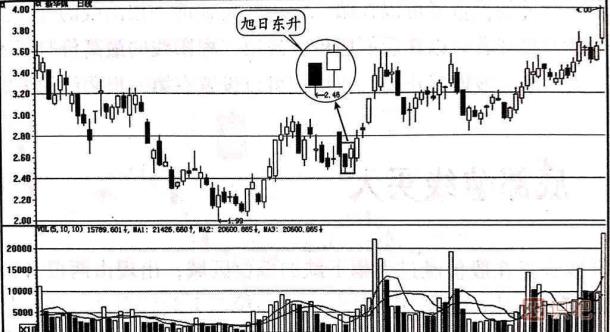 旭日東升屬于底部反轉(zhuǎn)信號(hào),下跌趨勢中股價(jià)經(jīng)過連續(xù)下挫,空頭能量已經(jīng)釋放殆盡。 在空方無力繼續(xù)打壓時(shí),多方奮起反擊,股價(jià)高開高走,前景又開始變得光明起來。 旭日東升中的陽線實(shí)體高出陰線實(shí)體的部分越多,轉(zhuǎn)勢信號(hào)越強(qiáng),投資者看到出現(xiàn)旭日東升后,不宜繼續(xù)看空做空,而要逢低吸納。