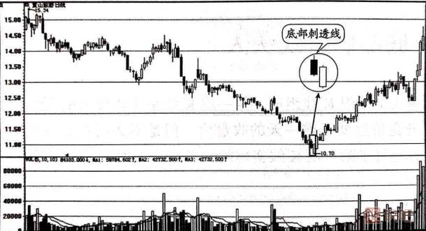 如圖1-4所示的是黃山旅游(600054)的日k線走勢圖。 該股從前期高點15.34元附近開始了持續(xù)的下跌行情,在圖中方框內(nèi)出現(xiàn)了底部刺透線的K線組合。其中第二天股價大幅跳空低開后并沒有繼續(xù)下跌,相反,股價被長期積累起來的多頭力量逐步推高,當(dāng)天收盤價超過了前一天中陰線實體的一半,并且成交量有所放大,說明多頭是有備而來,力量不容忽視,是買入股票的信號。 后面幾天的股價都在第二根陽線實體一半的上方運行,說明走勢處于強勢之中,此時投資者可以果斷買入股票。