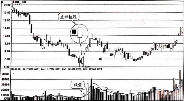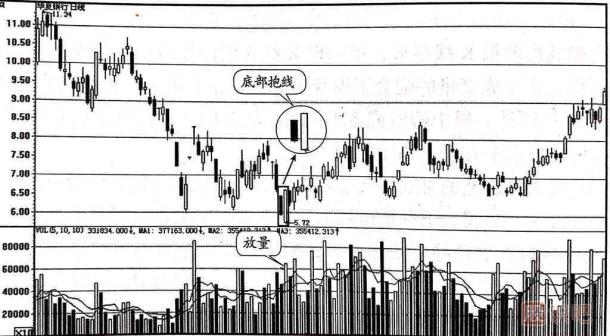 如圖1-2所示的是華夏銀行(600015)的日k線走勢(shì)圖。 該股從前期的高點(diǎn)11.34元開始下跌,在圖中所示的方框內(nèi)第一根K線處收出一根幾乎光頭光腳的中陰線,第二天收出一根幾乎是光頭光腳的大陽線,將第一天的中陰線完全吞沒,從而形成了抱線的K線組合。 仔細(xì)分析這兩根K線,可以發(fā)現(xiàn),首先,這個(gè)抱線出現(xiàn)在股價(jià)的大幅下跌50%之后,然后,中陰線和大陽線的實(shí)體的長(zhǎng)度相差雖然不是非常懸殊,但是第二根大陽線處的成交量已經(jīng)開始放大。 綜合分析可以得出多方主力已經(jīng)開始發(fā)動(dòng)行情的結(jié)論,所以,投資者應(yīng)及時(shí)買入股票,后面會(huì)有一輪上升行情。