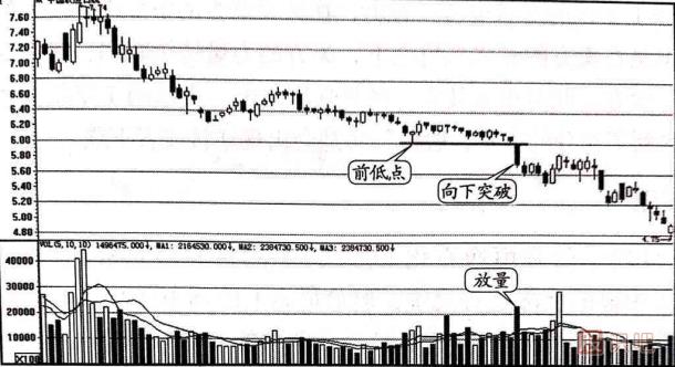 前低跌破賣出是指股價(jià)在經(jīng)過一波下跌后出現(xiàn)了不同程度的反彈,當(dāng)反彈結(jié)束,股價(jià)再次以中、大陰線突破反彈前股價(jià)的低點(diǎn),隨后將形成一波主跌走勢(shì),當(dāng)出現(xiàn)這樣的陰線時(shí),投資者應(yīng)及時(shí)跟隨主力賣出股票,如圖1-15所示。接下來由股識(shí)吧來提醒您單根K線前低跌破賣出,不明白的來掌握下。