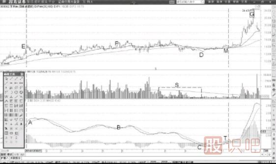 當(dāng)MACD指標(biāo)很快企穩(wěn)以后,我們能夠看到價(jià)格也同樣表現(xiàn)出強(qiáng)勢狀態(tài)。價(jià)格從D位置反彈以后,我們持股成本價(jià)在M位置的14元附近。股價(jià)飆升至G位置的24元,我們可以盈利達(dá)71%。
