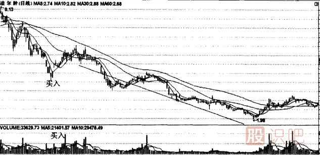 3、價(jià)格趨勢(shì)走在均線上,價(jià)格下得并未跌破均線且立刻上升,也是買(mǎi)進(jìn)信號(hào)。