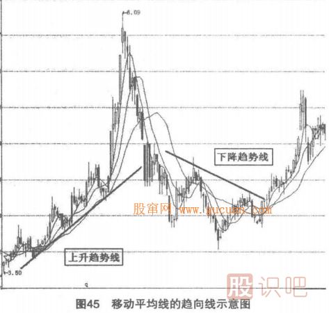 所謂趨向線就是上漲行情中兩個(gè)以上的低點(diǎn)的連線以及下跌行情中兩個(gè)以上高點(diǎn)的連線,前者被稱為上升趨向線,后者被稱為下降趨向線。上升趨向線的功能在能夠顯示出股價(jià)上升的支撐位,一旦股價(jià)在波動(dòng)過(guò)程中跌破此線,就意味著行情可能出現(xiàn)反轉(zhuǎn),由漲轉(zhuǎn)跌;下降趨向線的功能在于能夠顯示出股價(jià)下跌過(guò)程中回升的阻力,一旦股價(jià)在波動(dòng)中向上突破此線,就意味著股價(jià)可能會(huì)止跌回漲(見(jiàn)圖45)。