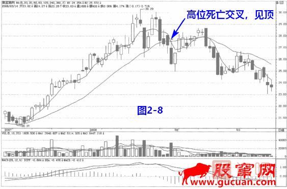 見(jiàn)圖2一8,股價(jià)經(jīng)過(guò)長(zhǎng)期的上漲,已出現(xiàn)明顯的滯漲行情,此時(shí)出現(xiàn)均線死亡交叉,要引起重視,下跌后股價(jià)無(wú)力冉向上拉起,投資者應(yīng)果斷離場(chǎng),將前期所賺的利潤(rùn)先落袋為安的好。