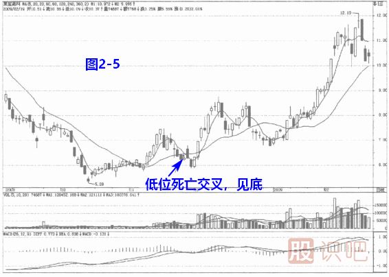 見(jiàn)圖2一5,股價(jià)經(jīng)過(guò)長(zhǎng)期的下跌,已初現(xiàn)企穩(wěn)跡象,在一次強(qiáng)勢(shì)上漲后回落,走出死亡交叉,股價(jià)已處在相對(duì)低位,并且多方力量已見(jiàn),空方最后的力量快被耗盡,投資者可擇機(jī)人場(chǎng)。