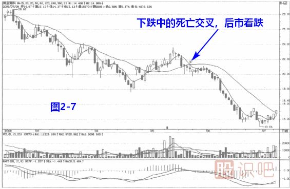 見(jiàn)圖2一7,股價(jià)處在長(zhǎng)期下跌中,股價(jià)略有反彈,卻再度向下,形成均線死亡交叉,投資者可擇機(jī)出局。