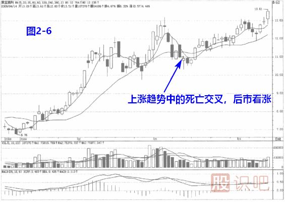 (2)上漲趨勢(shì)中均線死亡交叉,后市看漲,擇機(jī)入場(chǎng)。